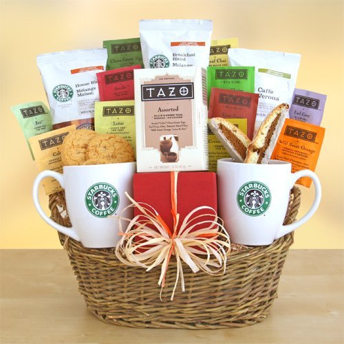 Starbucks Celebration Gift, When a winter chill sets in, look for heart- and hand-warming gifts like the Starbucks Celebration Gift Basket, a unique and generous way to show you care. This natural, rustic basket is filled with quality Starbucks coffees and Tazo teas, plus scrumptious cookies to set off the flavor of the hot beverages. It's a warm and cozy solution for goosebumps and gift giving. Gift Basket Includes Tazo teas, Starbucks Breakfast Blend, House Blend, and Caffe Verona coffees, two Starbucks signature mugs, Nonni's biscotti, shortbread cookies Ensure freshness: During warm weather, we highly recommend selecting "Next Day" or "2 Day" shipping at checkout. We can guarantee proper delivery of chocolates and perishable goods only if one of these delivery options is chosen. After all, you selected chocolates, not chocolate sauce. Also, please note that to avoid spoilage, some perishables may be replaced with items of comparable value and deliciousness. Please note that for this item, the following services are available during the checkout process: Multiple Ship-To, which allows you to send gifts to several recipients with a single order. Future Delivery, which lets you select a specific date for delivery, so your gift arrives at the perfect time. About Givens and Company In the early 1900s, Joseph Givens was a fine foods purveyor in Missouri. He and his family were known for providing delicious assortments of treats and fresh fruits to eager customers. Over 80 years later, the Givens' grandchildren came together to reignite the family tradition, and thus Givens and Company was born in California. In operation since 1987, they are thrilled to provide you with the cream of the crop when it comes to gourmet wine, food, desserts, and fruits straight from California. All of these delicious items are packaged in gorgeous gift baskets and packages that cater to any and all occasions. Givens and Company offers a huge selection designed to su